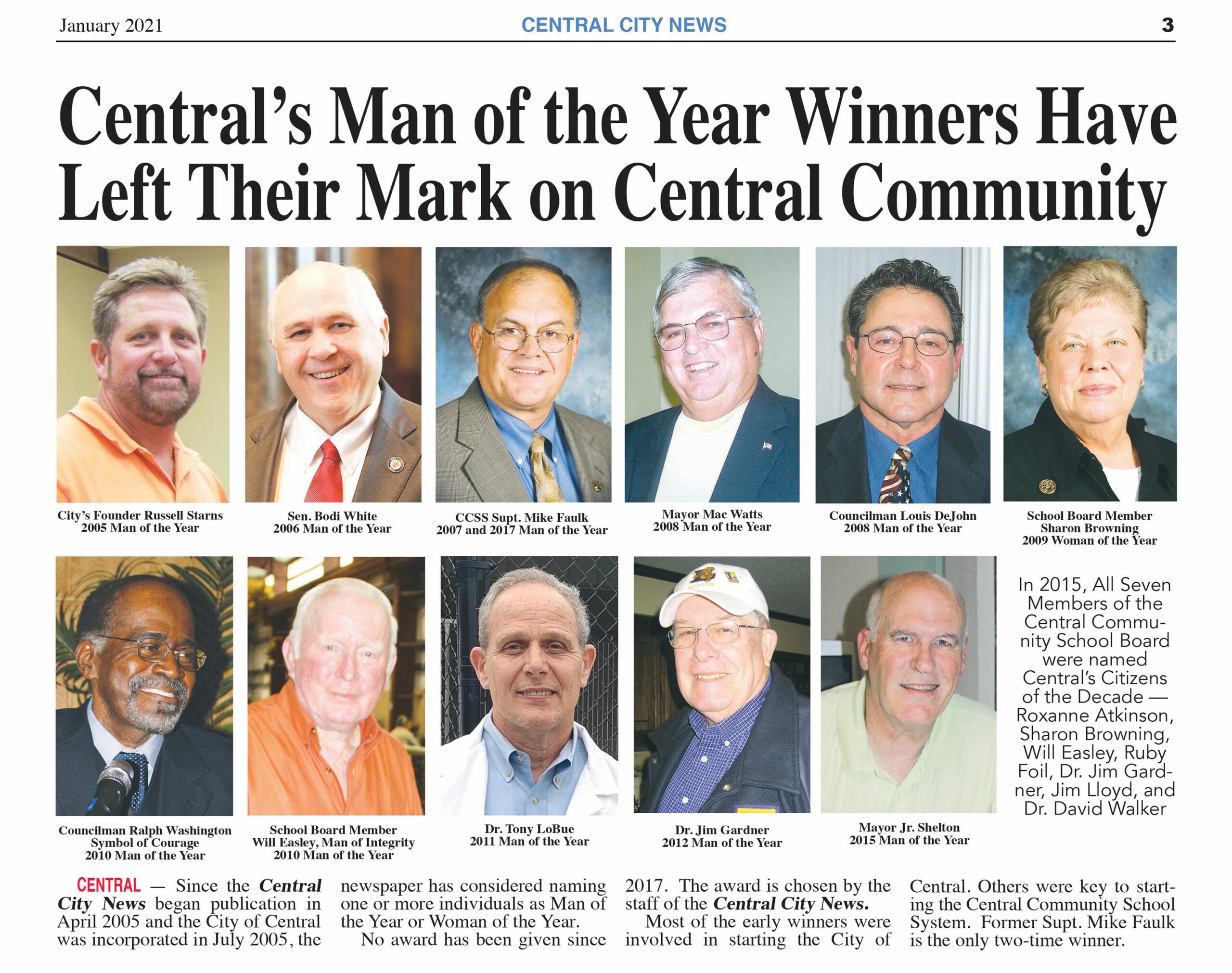 Most of the early winners were involved in starting the City of Central. Others were key to starting the Central Community School System. Former Supt. Mike Faulk is the only two-time winner.