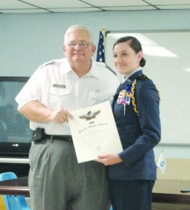 Cadet Mary Palasi was presented the General Ira C. Eaker Award by Louisiana Wing Commander Col. Art Scarbrough at the recent meeting of the Capitol City Squadron.