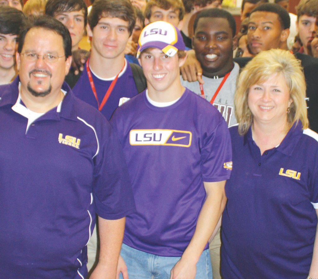 TREVOR SANSONE — THE CENTRAL FLYER — WITH FAMILY — Central High School senior Trevor Sansone has signed a track scholarship with LSU. Sansone is the State Champion in the 100-meter dash outdoors and the 55-meter dash indoors. Shown with family and Central High football team members at the Central High gym last Friday.